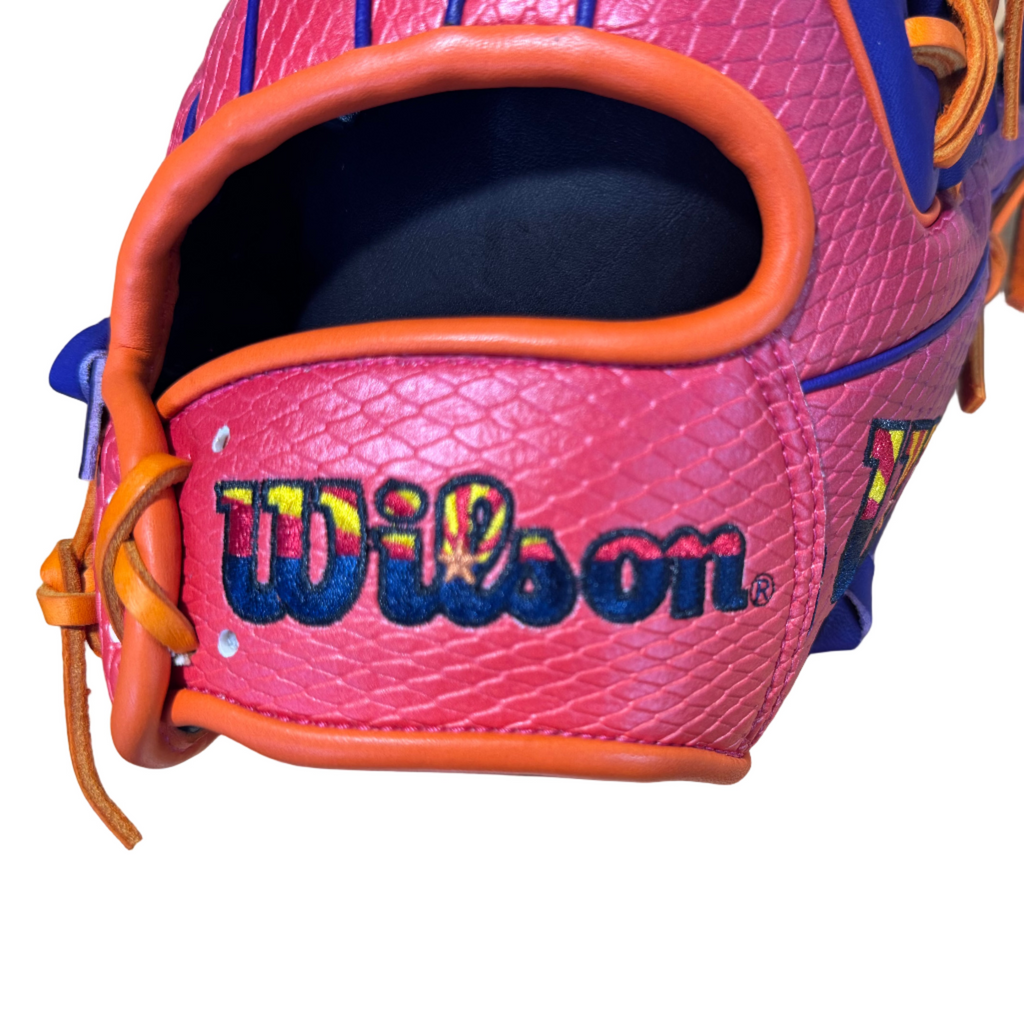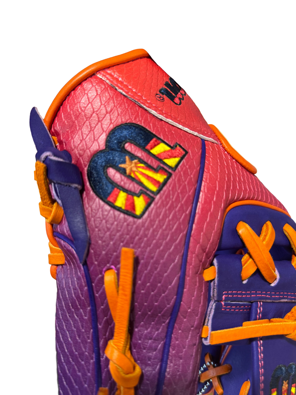 Bring the heat with the 2025 Wilson A2000 1786 “Arizona Sunset” Exclusive, a glove designed to stand out just as much as it performs. Inspired by the bold hues of an Arizona evening sky, this A2000 features a vibrant red and purple Pro Stock® leather build with orange laces and accents that pop under any light.