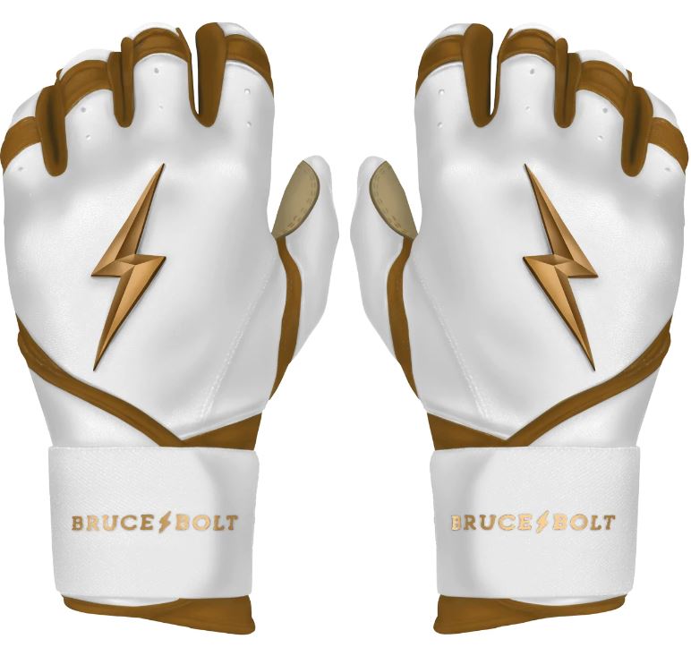 HIGHEST QUALITY, MOST DURABLE BATTING GLOVE IN BASEBALL: Each pair of BRUCE BOLT batting gloves are handmade by skilled craftsmen. Our GOLD Series gloves use 1.2mm Cabretta leather on the palm and the back of the glove which makes them buttery soft and more durable while providing better grip than any other glove on the market.