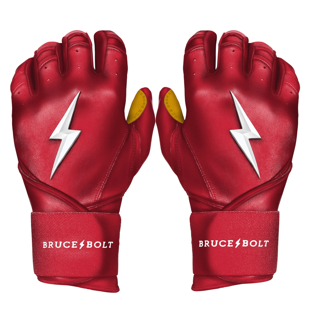 Are you ready to take your game to the next level? Check out the Bruce Bolt Youth Premium Pro Long Cuff Batting Gloves in Red! These gloves are the highest quality and most durable batting gloves in baseball. They are handmade by skilled craftsmen using only the finest 0.9mm Cabretta leather and stitching techniques, making them buttery soft and incredibly durable. The double reinforced Cabretta leather palm ensures that the gloves don't get hard or crunchy, simply rub with leather conditioner or mink oil allowing them to stay soft as when you first bought them. And with the patent pending double inverse cuff design, these gloves offer unmatched wrist support and power for a more powerful swing and protection against nagging wrist injuries.
