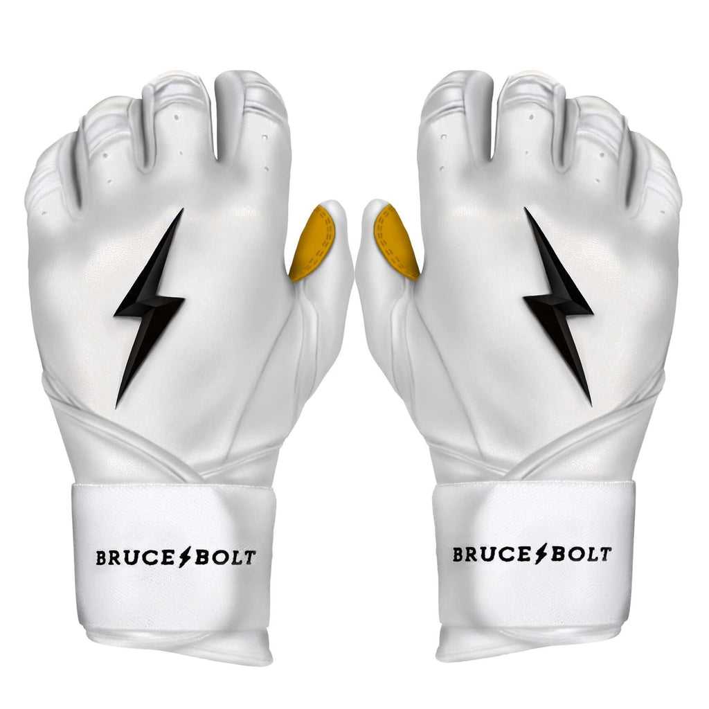 The Bruce Bolt Premium Pro Long Cuff Batting Gloves are the highest quality and most durable batting gloves in baseball. Each pair is handmade by skilled craftsmen using only the finest 0.9mm Cabretta leather and stitching techniques, resulting in gloves that are buttery soft yet more durable than any other on the market.