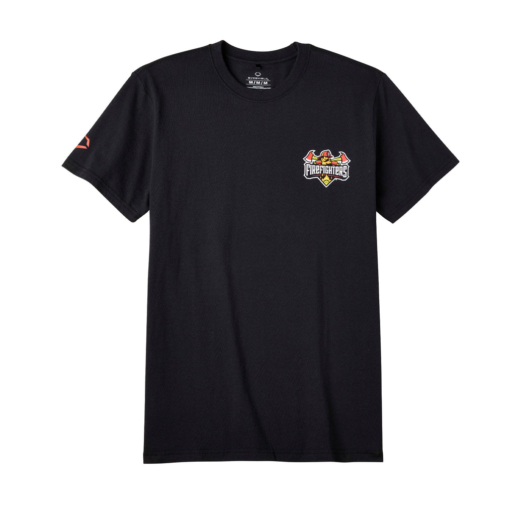 The front of the shirt features a clean Firefighters chest logo for a subtle team-inspired look. On the back, a bold graphic reads “Firefighters – Hottest Team in Sports,” paired with a baseball bat design that captures the excitement and humor of exhibition baseball culture. The vibrant red and yellow embossed-style print pops against the black fabric, creating a striking contrast that makes this tee stand out from the crowd.