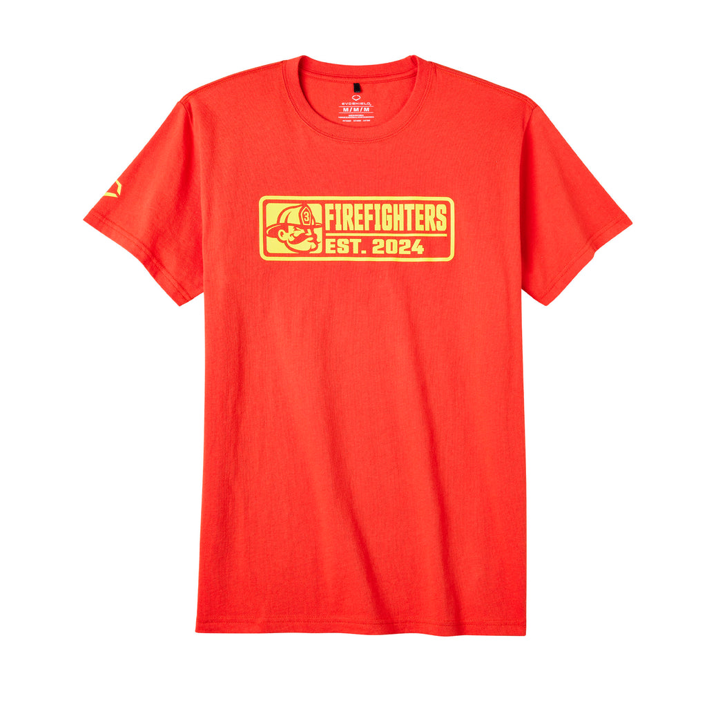The EvoShield Youth Firefighters HWY80 Tee features a vibrant red colorway that instantly stands out. The front graphic displays the Firefighters logo alongside “Firefighters Est. 2024,” giving the shirt a vintage team-inspired look that young fans will love. The bold yellow graphic pops against the red fabric, creating a sporty design that feels right at home at the ballpark, at school, or during everyday activities.
