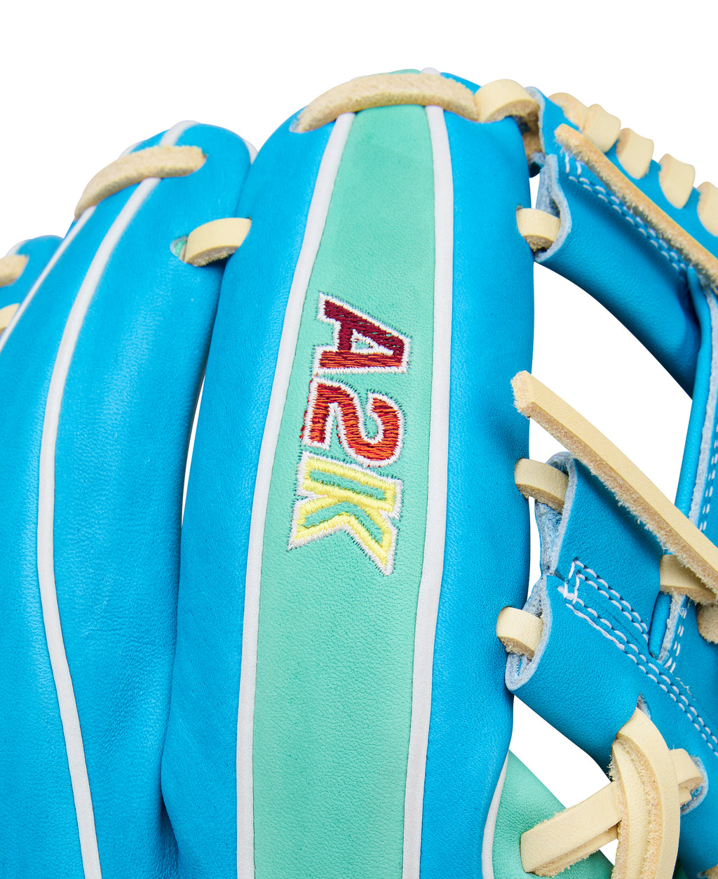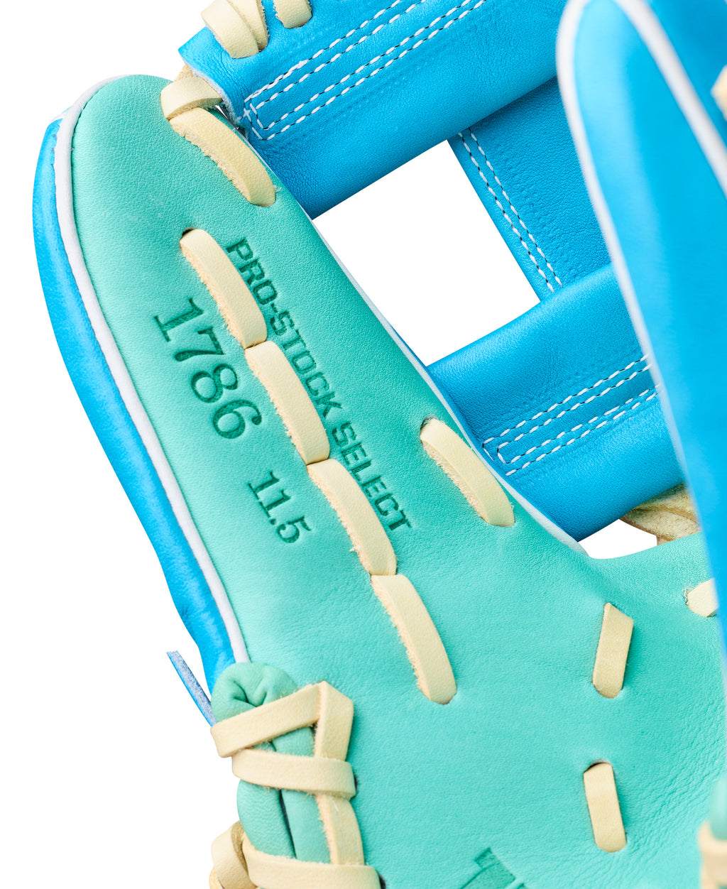 Constructed from flawless Tropical Blue and Seafoam Pro Stock® Select leather, this glove combines durability with exceptional feel. Each hide is triple-sorted to ensure only the top five percent of leather is selected for softness, stretch, and long-lasting performance. The Double Palm Construction adds an extra layer of leather between the palm shell and liner, reinforcing pocket stability while helping the glove maintain its shape through seasons of play.
